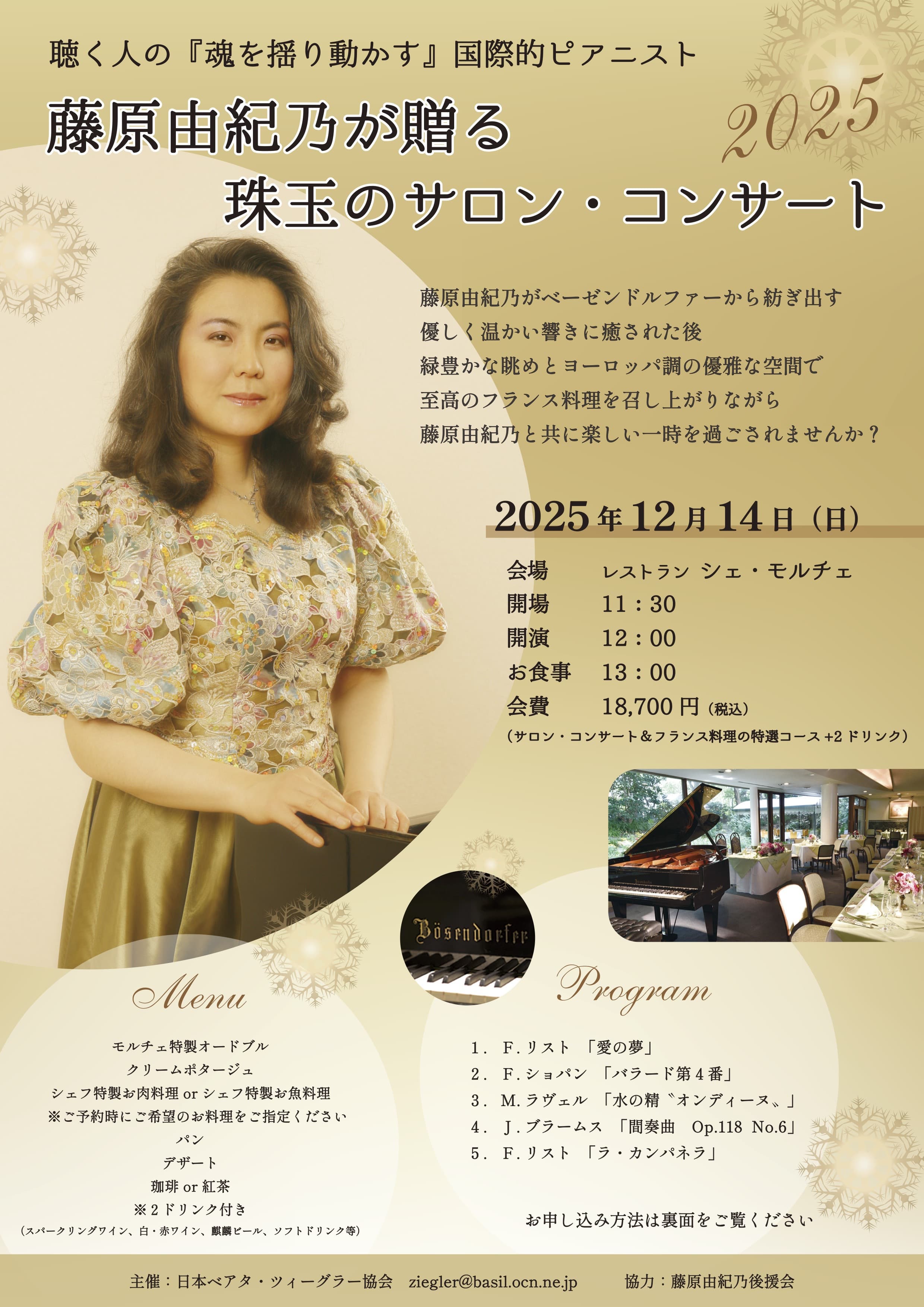 先月半ばに、母の介護が少し落ち着いて参りましたので、本年12月14日(日)に東京・広尾のレストラン「シェ・モルチェ」のフランス料理とベーゼンドルファーの至極の空間で、「藤原由紀乃が贈る 珠玉のサロン・コンサート」を5年振りに開催する運びとなりましたので、ご案内申し上げます。