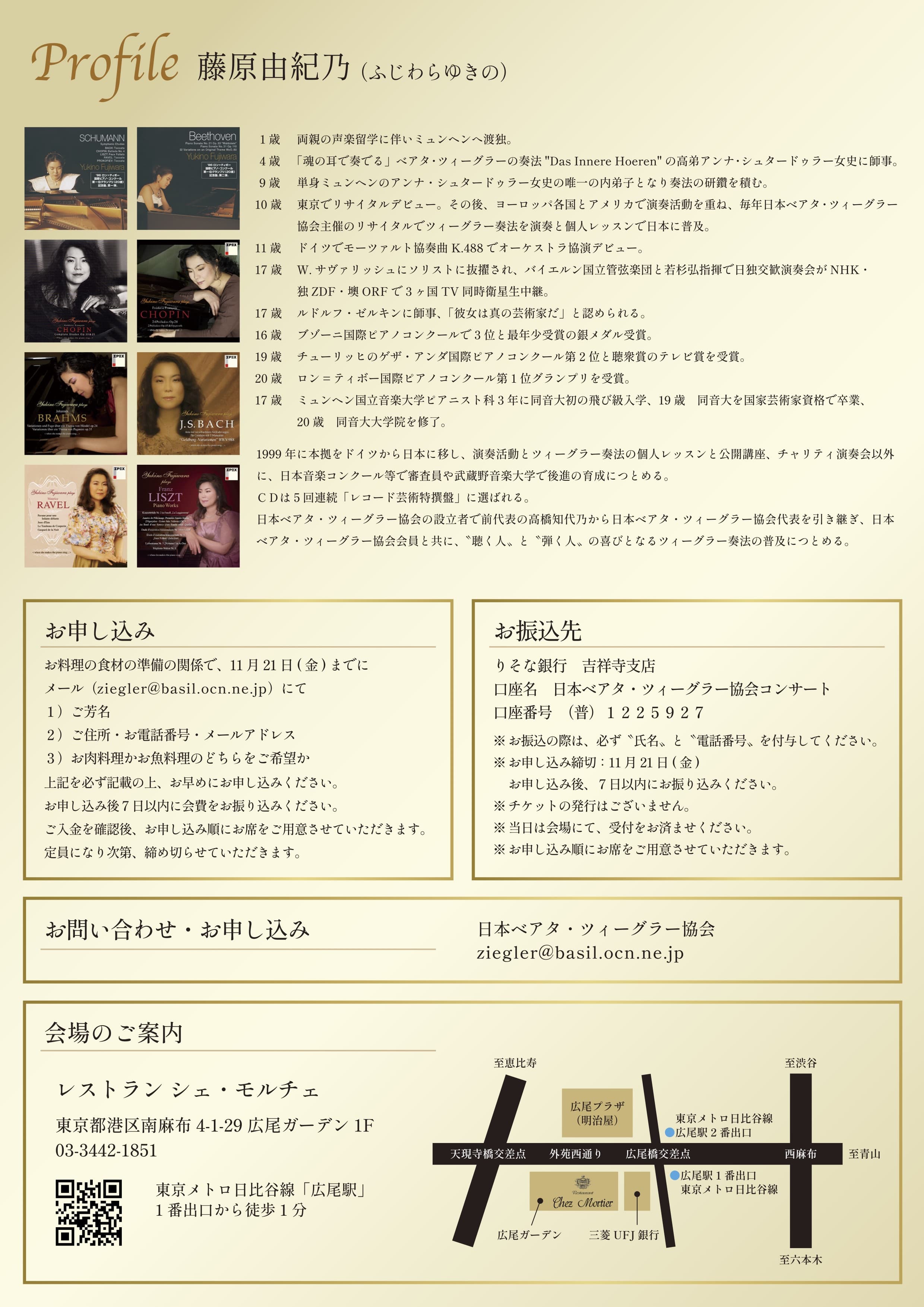 演奏後は美味しいフランス料理を味わい乍ら、皆様とお話できますことをとても楽しみにしております。